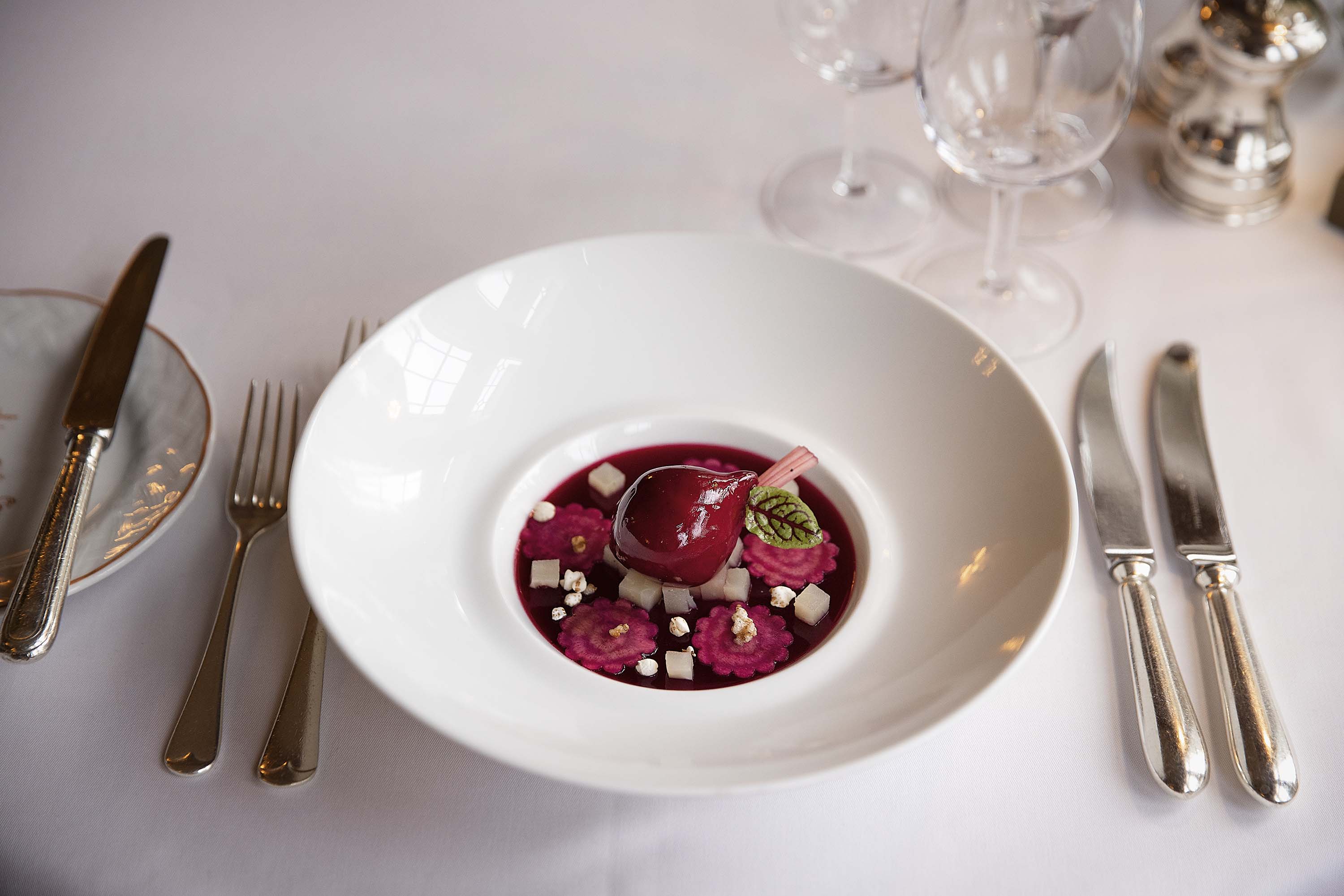 An additional Gourmet Corner area of the menu offers dishes which carry a supplement but offer something a little special. Examples include a Exmoor Baerii Caviar dish or a beef dish with Eryngii Mushrooms and Mooli.