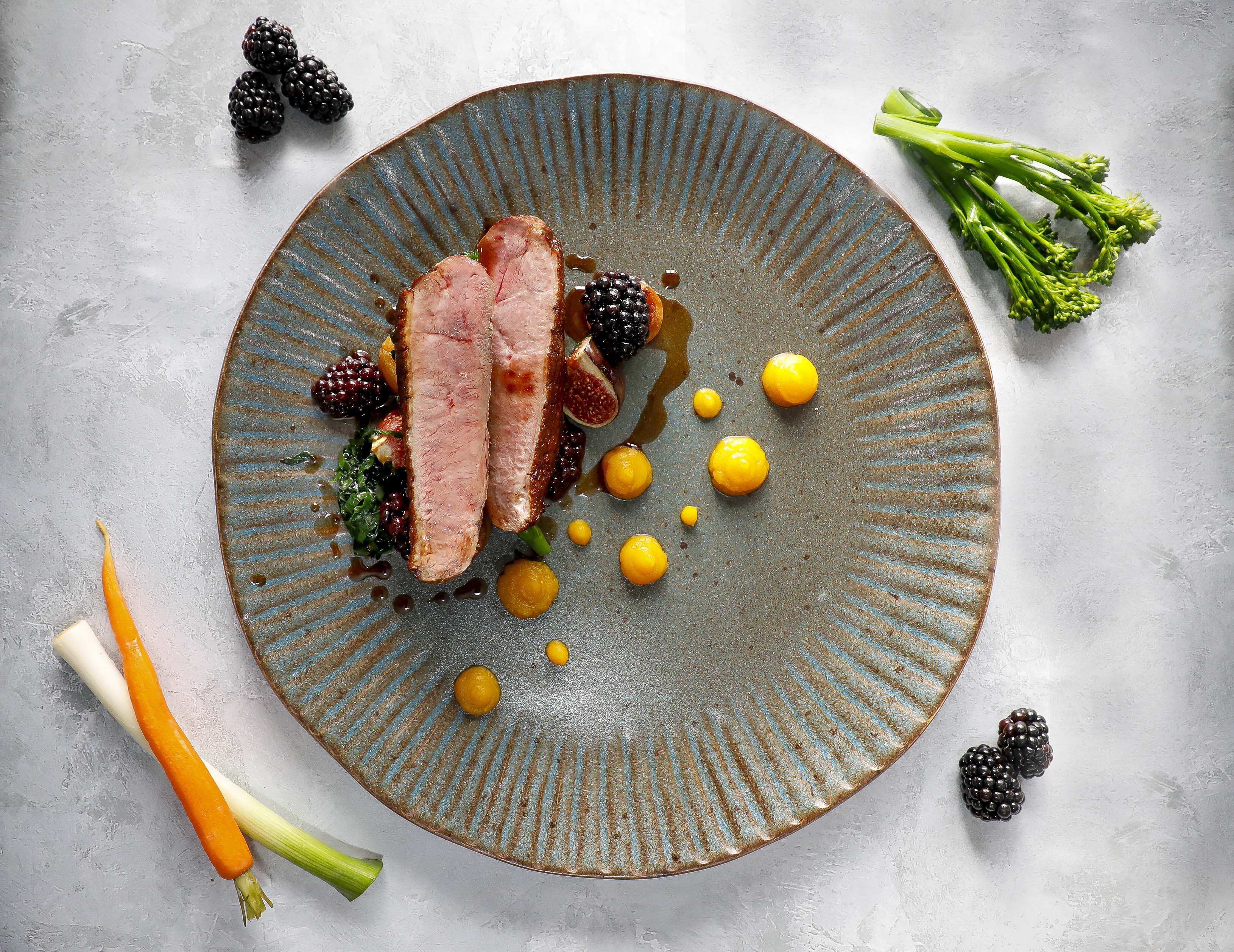 Pan roasted Barbary duck breast with pumpkin purée, fondant potato, purple kale, roasted fig and blackberry jus £17.