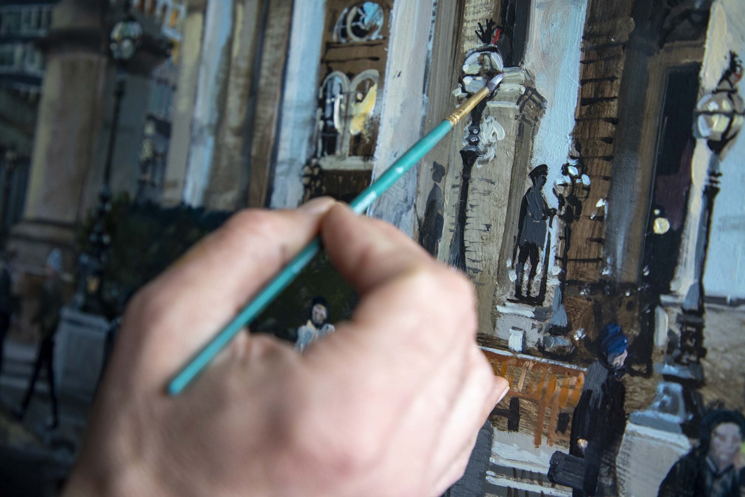 “I much prefer to be on the street, seeing how the light changes and watching people pass by. I complete as much as I can in the field and then finish off each composition in the studio.”